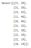 t1 = torch.tensor([[21,39],[31,30],[23,43],[11,46],[26,46],[31,25],[21,38],[22,39],[22,19],[18, 14]])