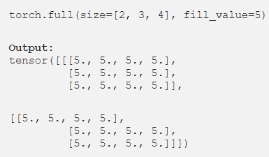 torch.full(size=[2, 3, 4], fill_value=5)