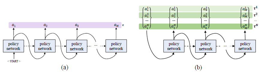 POMO는 N개의 다른 노드들($a_1^1 , a_1^2 , a_1^3 , a_1^4... , a_1^N$) N개의 샘플 설루션의 경로 ($\tau^1,\tau^2 , \tau^N$)을 샘플링한다.