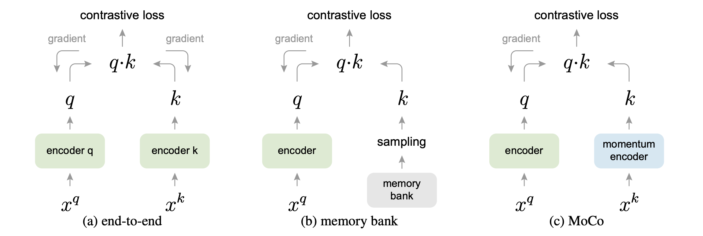data-augmentated versions($o$의 $o_q$ 와 $o_k$ )의 임베딩을 얻기 위해서 contrastive loss를 사용한다.