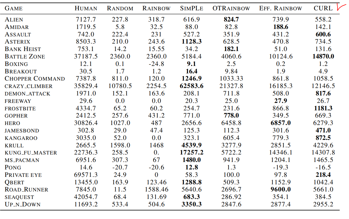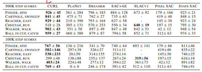CURL은 지금까지 학습 세계 모델 및 (또는) 디코더 기반 목표에 의존하는 접근 방식이 지배하는 복잡한 작업에 대한 최첨단 성능을 보여주기 위해 최소한의 아키텍처 변경으로 대조 학습으로 가속화된 최초의 model-free RL 파이프이라고 한다.