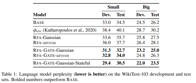 - quadratoc에서 linear로 복잡성을 떨어지면서, RFA는 인풋 TEXT가 더 길 때, 더 유의미한 성능을 낼 수 있습니다.