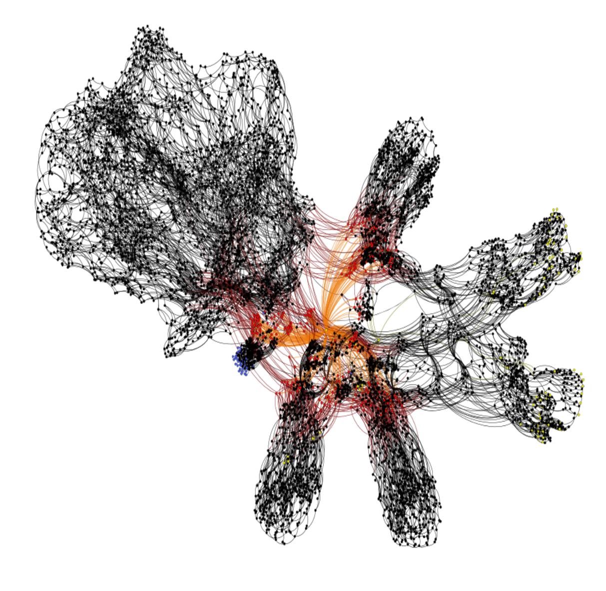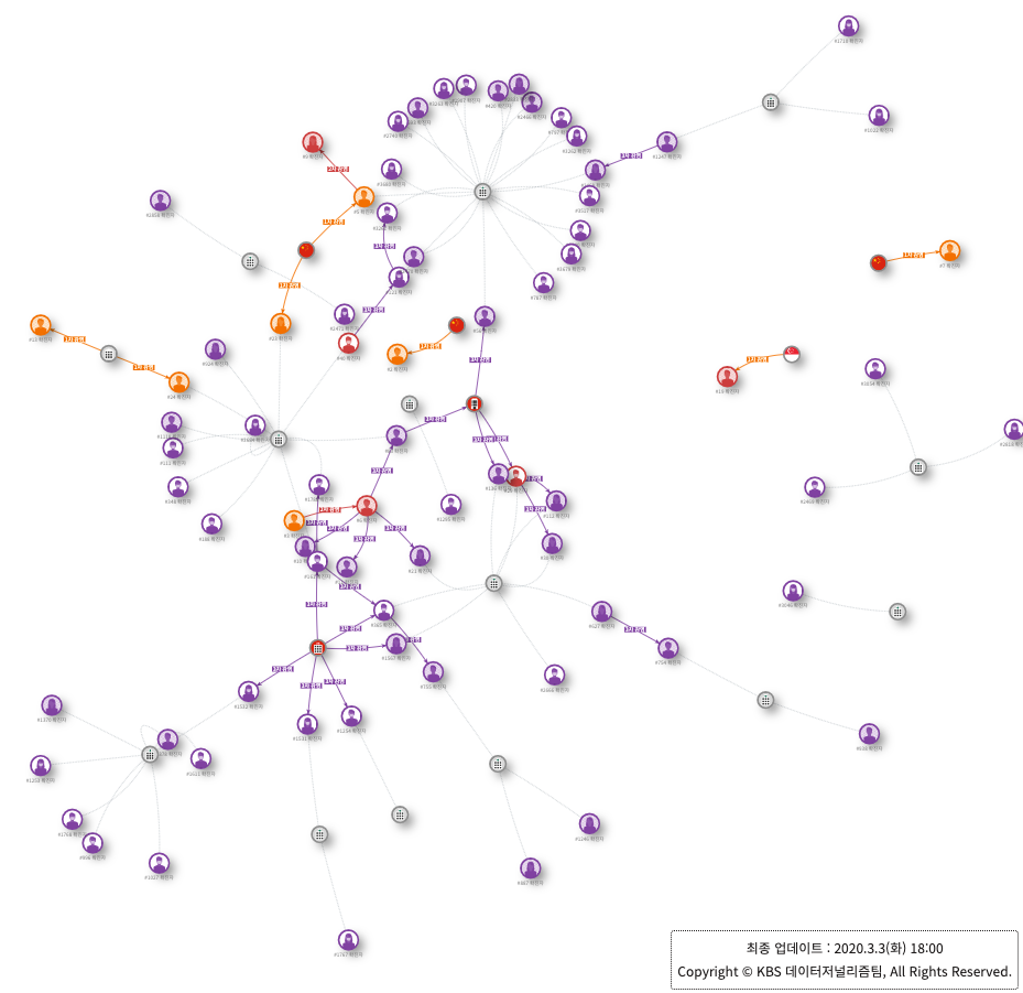 - 소셜 네트워크, 미디어의 영향, 바이러스 확산 등을 연구하고 모델링할 때 사용할 수 있다. 소셜 네트워크 분석은 데이터 과학에서 그래프 이론을 사용하는 가장 잘 알려진 분야일 것이다. 최근 뉴스에서 코로나 19 확산, 이동경로를 나타내고 분석할 때 자주 등장한다. 아래 이미지도 그중 하나이다. (실제로 3번과 같인 이유에서 GNN을 배우고 싶었던 이유가 있다. 복잡한 사람들 사이의 관계를 기존에 내가 알고 있던 지식으로 한계를 느꼈다)