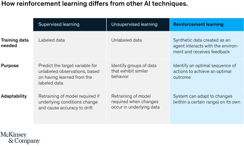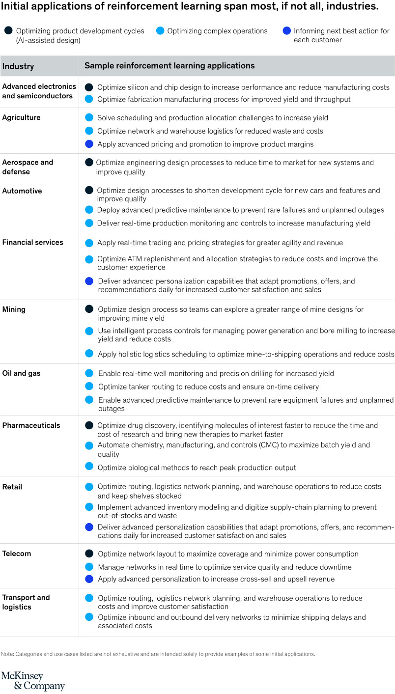 First, reinforcement learning can help organizations identify the right actions to take across a value chain as events unfold. A transportation company, for example, can optimize travel routes in real time based on changing traffic, weather, and safety conditions. A food producer can optimize product distribution worldwide amid daily, even hourly, fluctuating demand and exchange rates, varying shipping routes, and more.