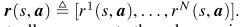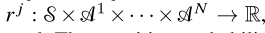 $S$ 는 state space $A^j$ 는 action space $j \in {1,2,... N}$ 각 에이전트의 리워드 함수는 다음과 같이 정의 된다.