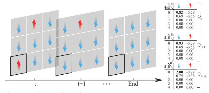 하이라이트 된 에이전트 j에서 t+1의 보상은 2다 그리고 주변은 동시에 아래를 향한다.