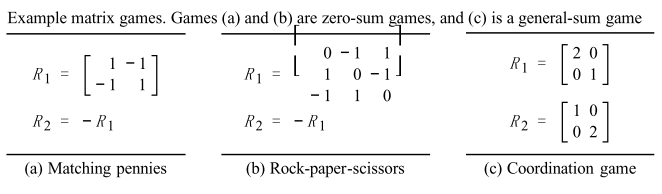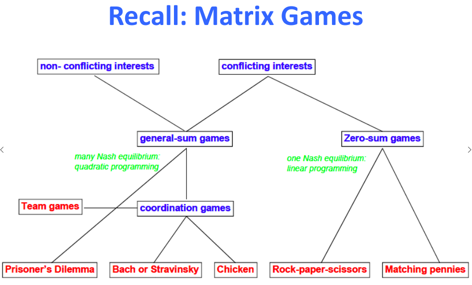 Matrix Game을 다음과 같이 크게 나눌 수 있다고 한다. 출동이 있는지 여부 / zero sum game 인지 general sum game인지 아니면 협력하는 게임인지 이것에 따라서 문제들에 따른 각각 예제들이 있는 것 같다.