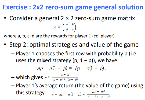 그래서 저 수식을 기반으로 하게 되면 각 전략에 대한 optimal value를 알게 된다. 즉 각 플레이들이 얻는 보상에 따라서 각각의 전략의 최적 값을 구할 수 있다는 것인 것 같다.