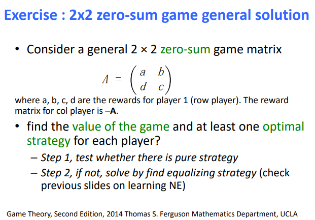 일반적은 2x2 zero sum game 예시를 보면은 A라고 하는 매트릭스는 player 1에 대한 보상을 의미하고 그 반대 -A는 다른 플레이어의 보상이라고 하자.