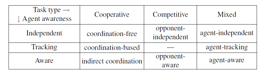 MARL 공간을 이해하는 데 가장 좋은 분류법 중 하나는 에이전트의 행동을 완전히 협조적이거나 완전히 경쟁적이거나 혼합된 것으로 분류하는 것입니다.