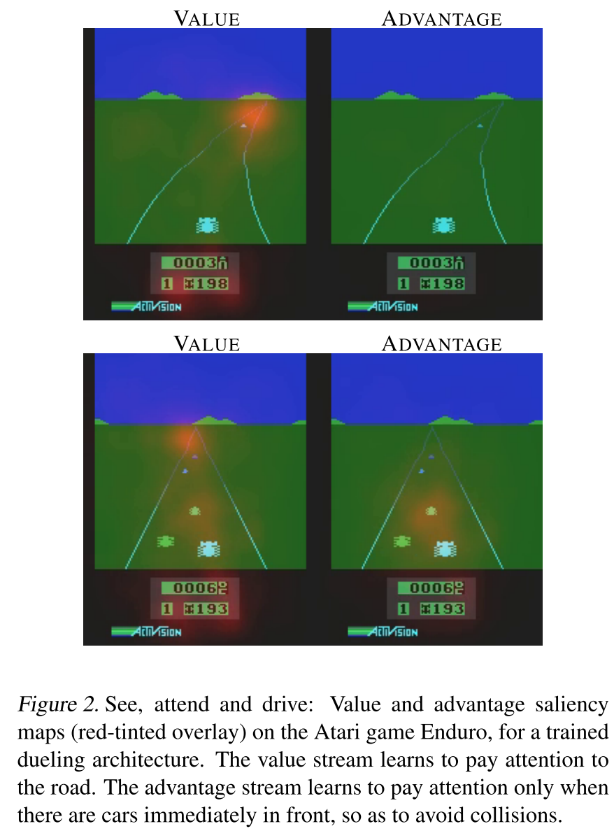 실험에서, 우리는 무관한 행동이나 유사한 행동이 학습 문제에 추가됨에 따라 dueling 아키텍처가 정책 평가 중에 올바른 동작을 더 빨리 식별할 수 있음을 보여줍니다. 그래서 이러한 부분을 신경 쓰기 위해서 advantage와 value function을 나눠서 estimator 하고자 하는 것 같습니다.
