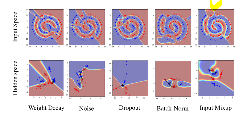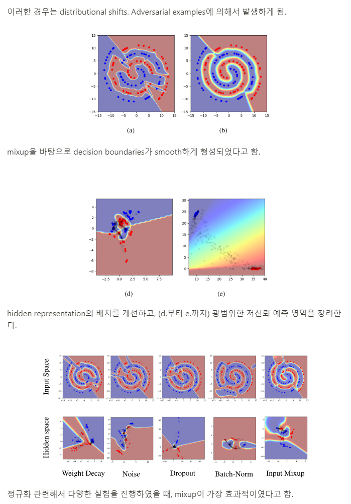 - 신경 네트워크가 hidden representation의 interpolations(보간버)에 대해 덜 자신 있게 예측하도록 장려하는 간단한 규칙화 장치