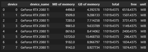 total_gpu_usage = pd.DataFrame([list(i.values())[0] for i in nvsmi.DeviceQuery('memory.free, memory.total, memory.id')["gpu"]])