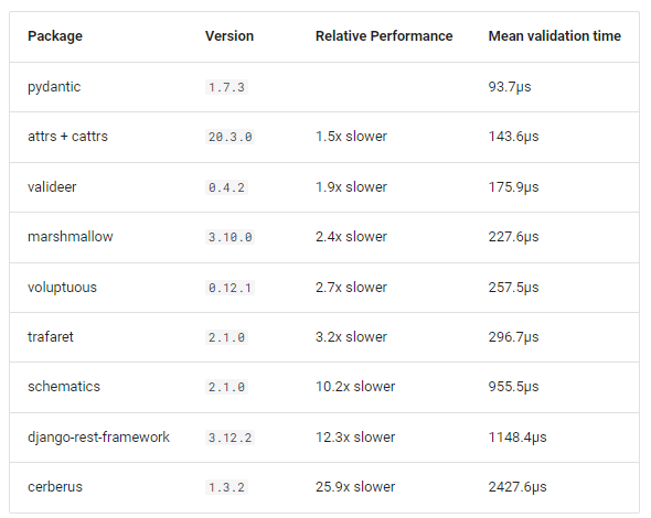 pydantic에서는 자신들이 가장 빠르다고 주장하고 있습니다.