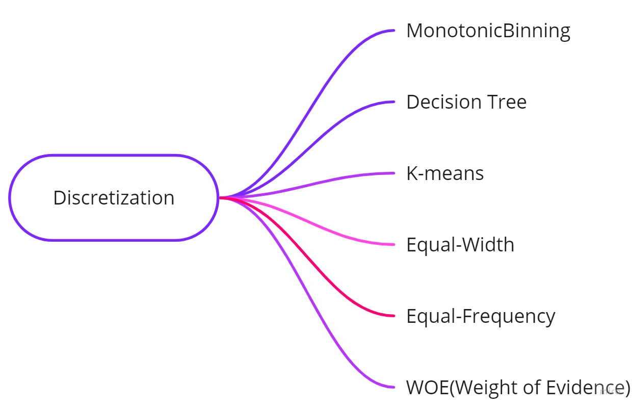 가장 일반적인 이산화 알고리듬은 equal-width 및 equal-frequency discretization입니다.