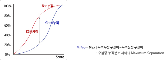 K-S 통계량은 우량 집단과 불량집단의 누적 분포의 차이를 나타내는 지표로 신용평가모형의 변별력 평가 시 주요 판별 통계량으로 활용됩니다.