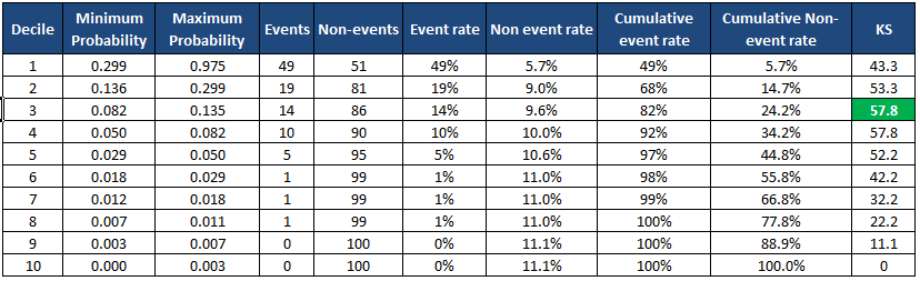 첫 번째 십분위수에는 가장 높은 확률 점수가 포함되어야 합니다. - 각 십분위에서 Event 및 Non-eVENT의 누적 퍼센트를 계산한 다음 이 두 누적 분포의 차이를 계산합니다.