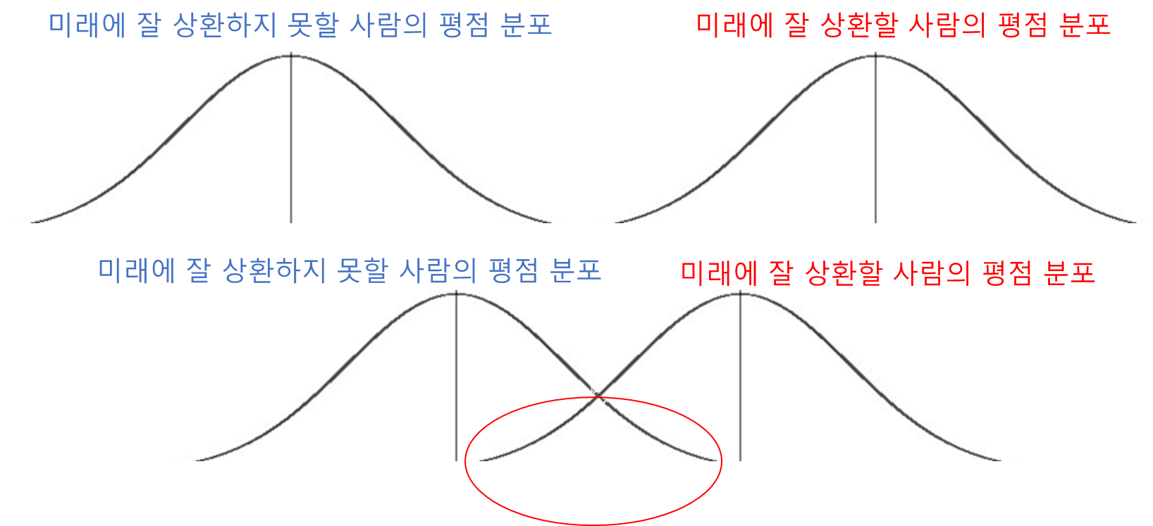 즉 아래와 같이 미래에 상환하지 못할 사람들과 상환할 사람을 잘 분리하게 되면, 좋은 모형이고,