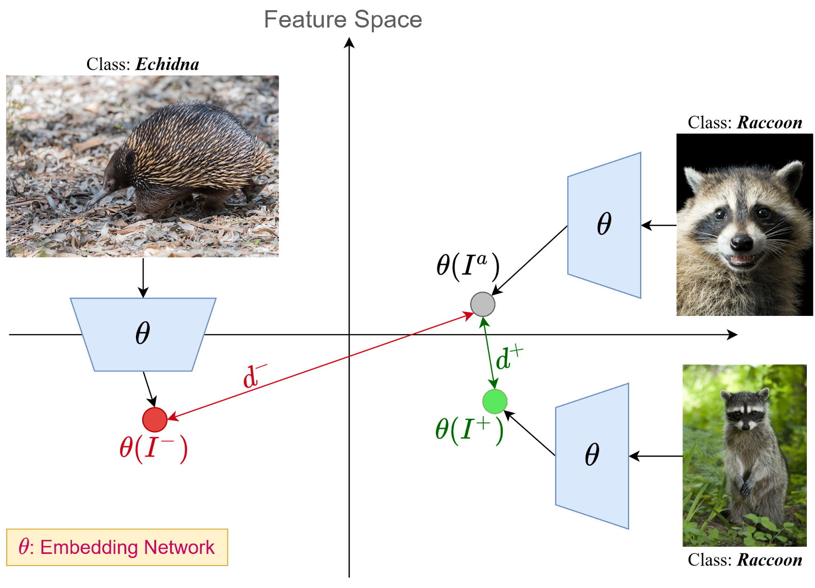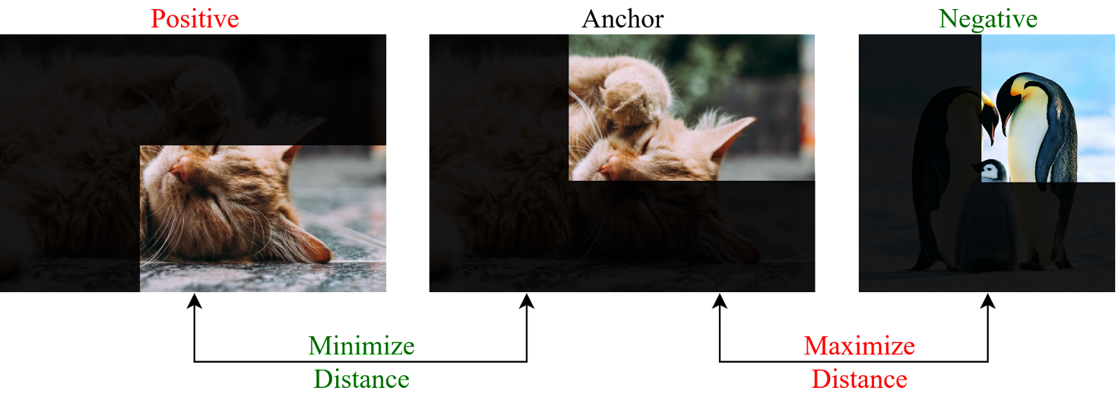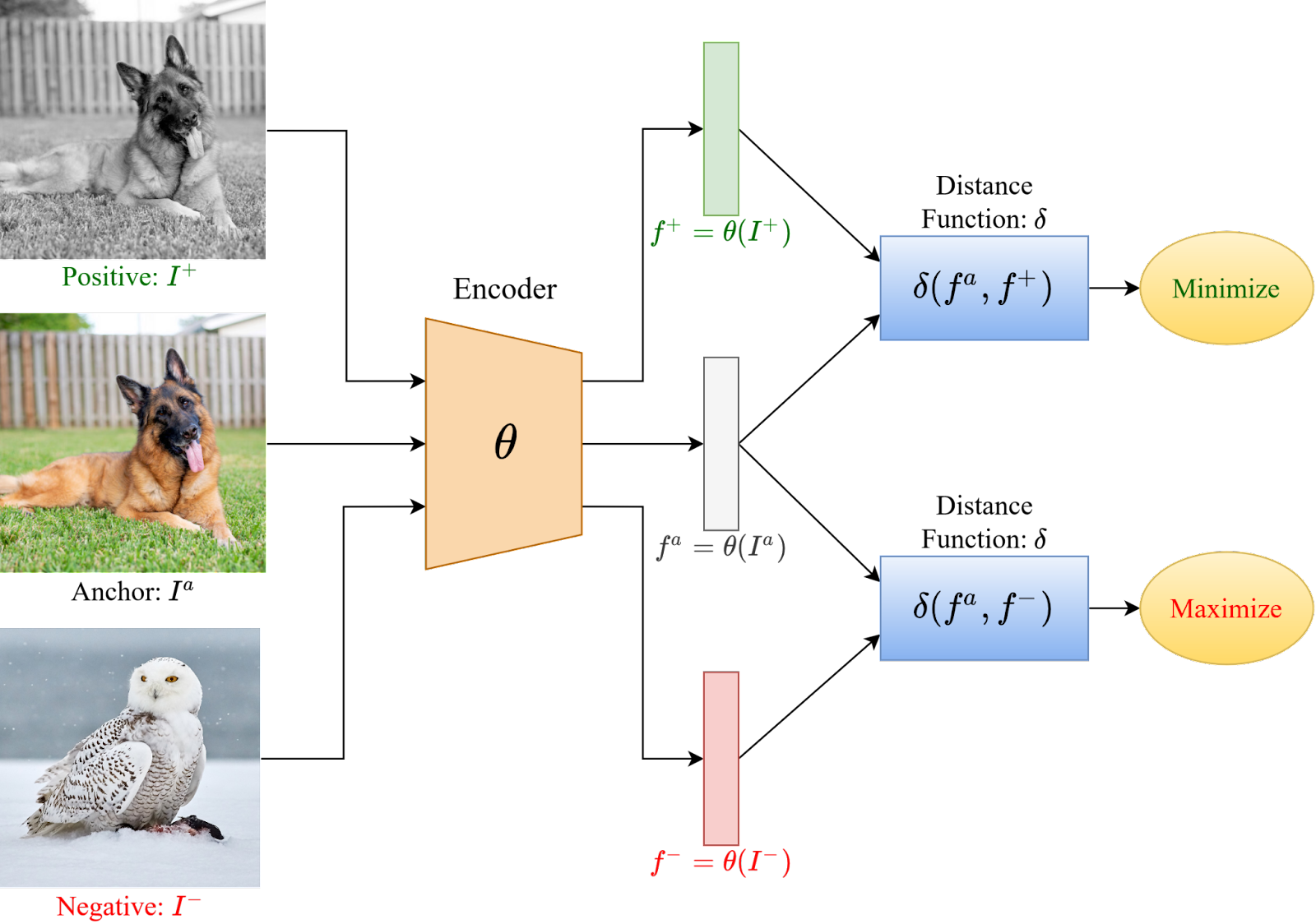 위의 예에서 보듯이, 같은 클래스에 속하는 두 개의 이미지는 임베딩 공간("d+")에서 서로 가까이 있고 다른 클래스에 속하는 이미지("d-")는 서로 더 먼 거리에 있다. 따라서, 대조적인 학습 모델(위의 예에서 "theta"로 나타냄)은 거리 "d+"를 최소화하고 거리 "d-"를 최대화하려고 한다.