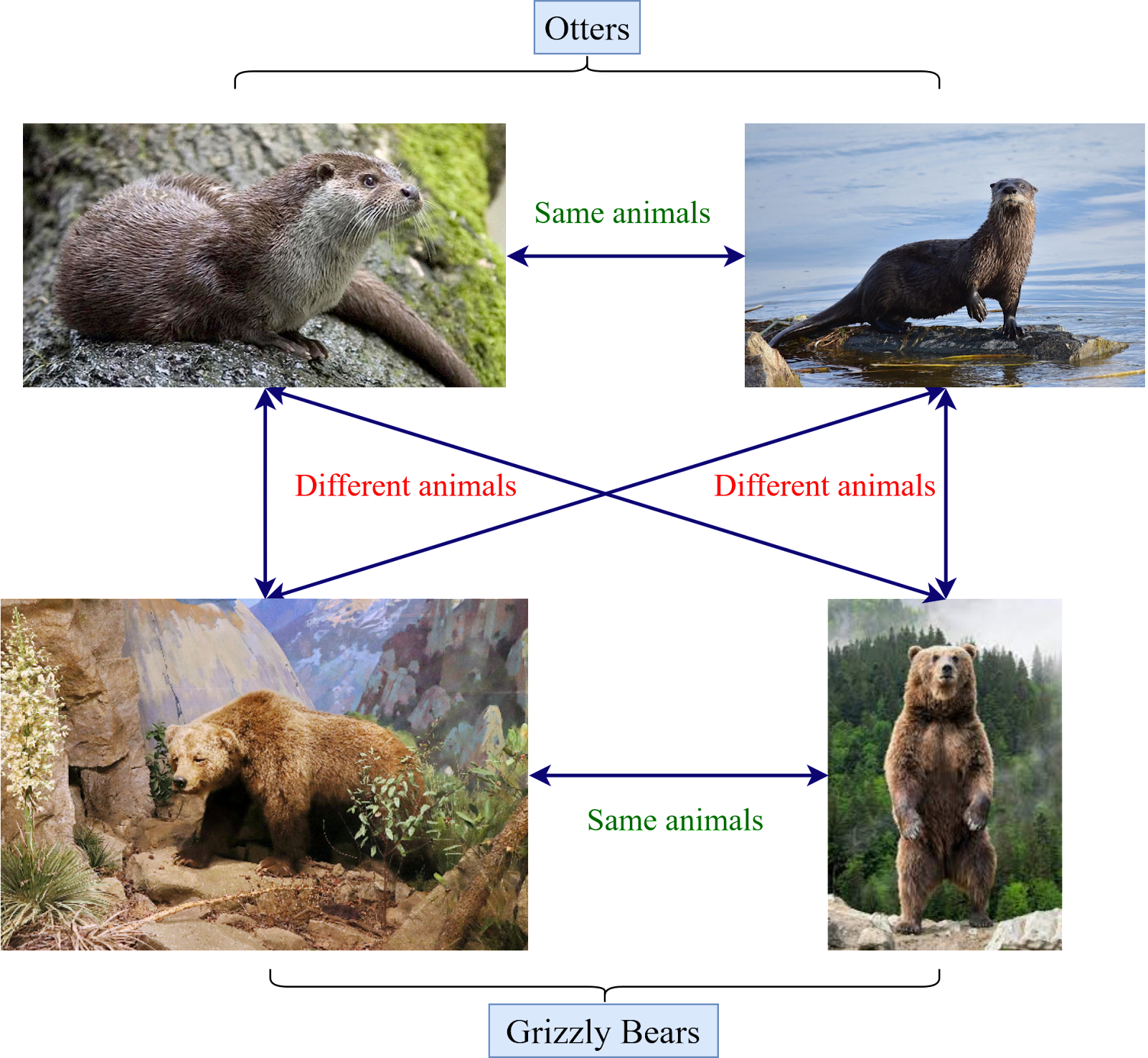 예를 들어, 우리는 수달이 무엇인지, 회색곰이 무엇인지 모를 수 있지만 이미지(아래 그림 참조)를 보면 최소한 어떤 사진이 같은 동물인지 유추할 수 있습니다.