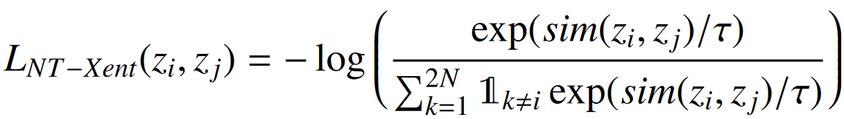 위의 방정식은 자체 지도 학습에 사용되는 NT-Xent 손실에 대한 식을 보여준다. 지도 학습의 경우, 위에 표시된 대조 손실은 라벨의 존재로 인해 둘 이상의 샘플이 동일한 클래스에 속하는 것으로 알려진 경우를 처리할 수 없다. 임의의 수의 긍정으로 일반화하면 가능한 여러 함수 중에서 선택할 수 있다.