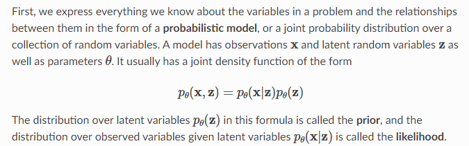 조인트 확률 함수는 다음고 같이 나올 수 있고, 여기서 p(z)는 사전(prior)이라하고, p(x|z)는 우도(likelihood)라고 한다.