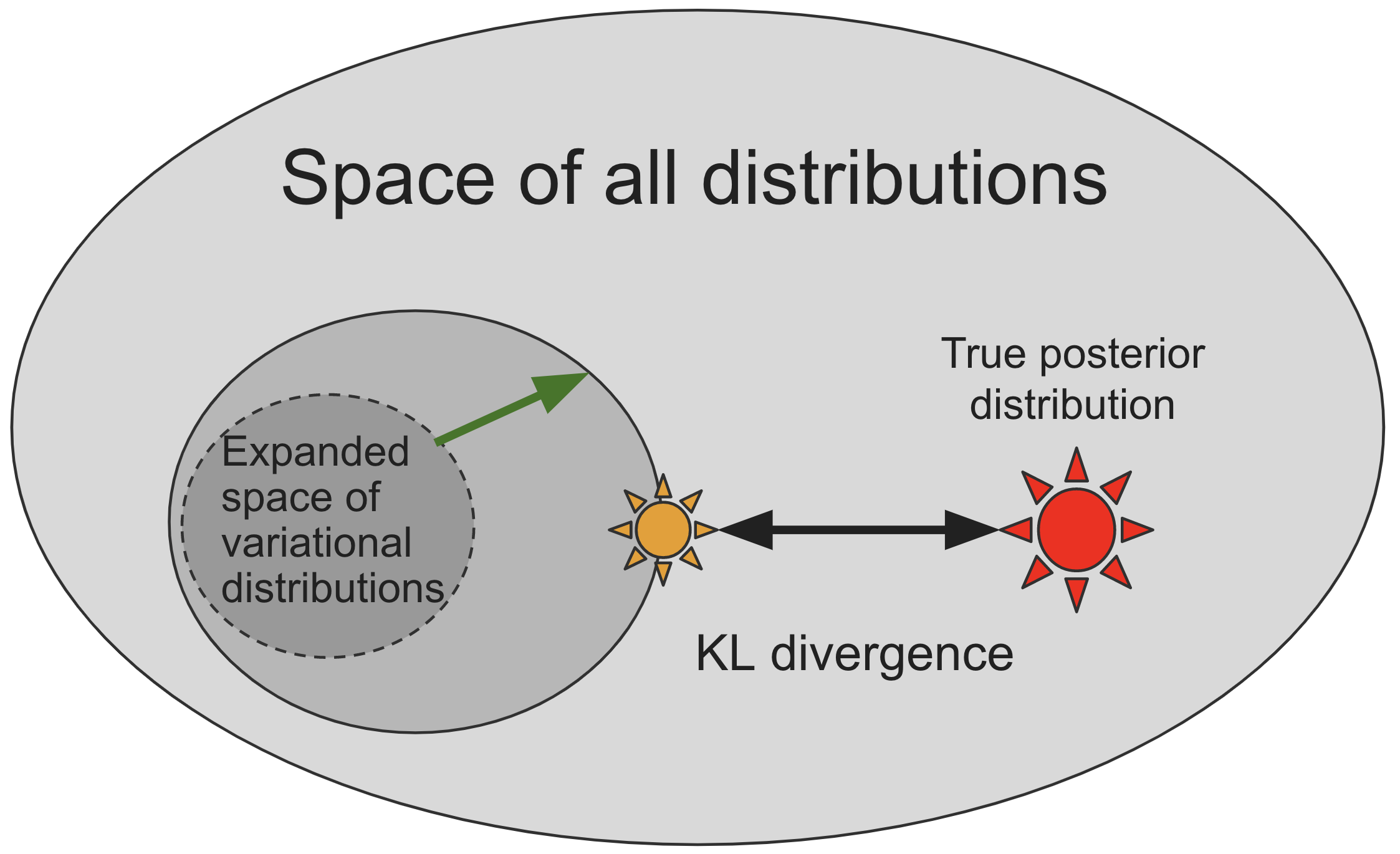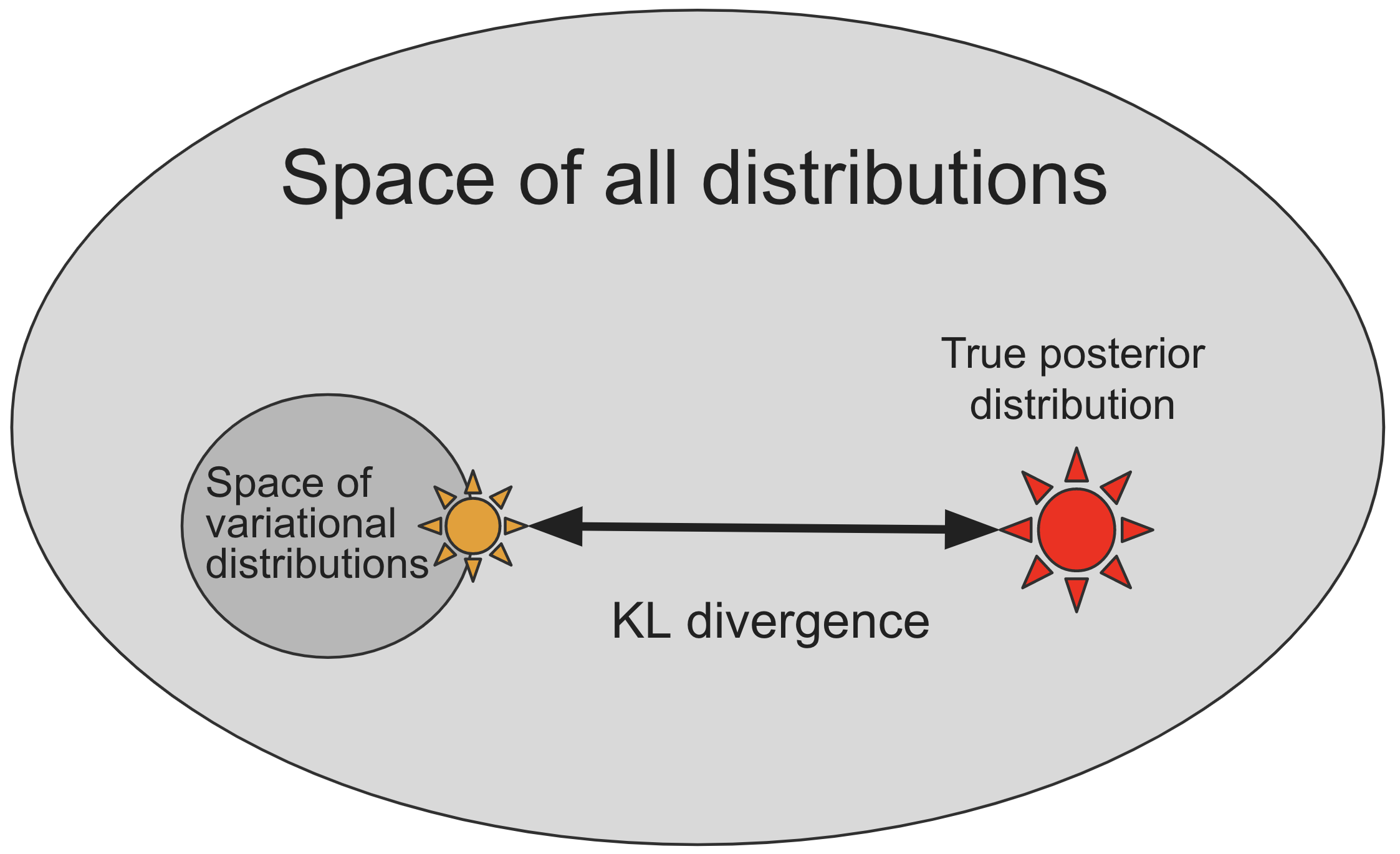 variational inference은 거리 또는 발산(divergence)(위의 그림의 검은 화살표)에 따라 실제 사후(아래 그림의 노란색 별)과 가장 유사한 것을 찾기 위해 변이적 분포 공간을 탐색함으로써 실제 후방과 근사한다.