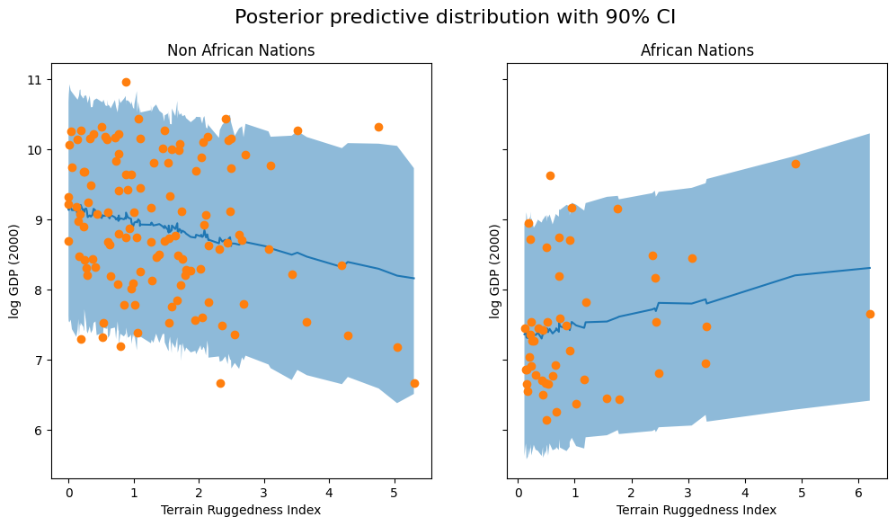 ax[0].fill_between(non_african_nations["rugged"], non_african_nations["y_perc_5"], non_african_nations["y_perc_95"], alpha=0.5)