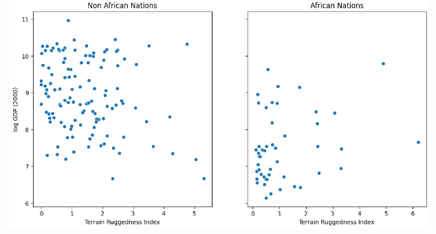 해당 예제에서는 Terrain Ruggedness Index(데이터 세트의 험한 변수)로 측정한 국가의 지형 이질성( tepographic heterogeneity)과 1인당 GDP 사이의 관계를 탐구하고자 합니다.