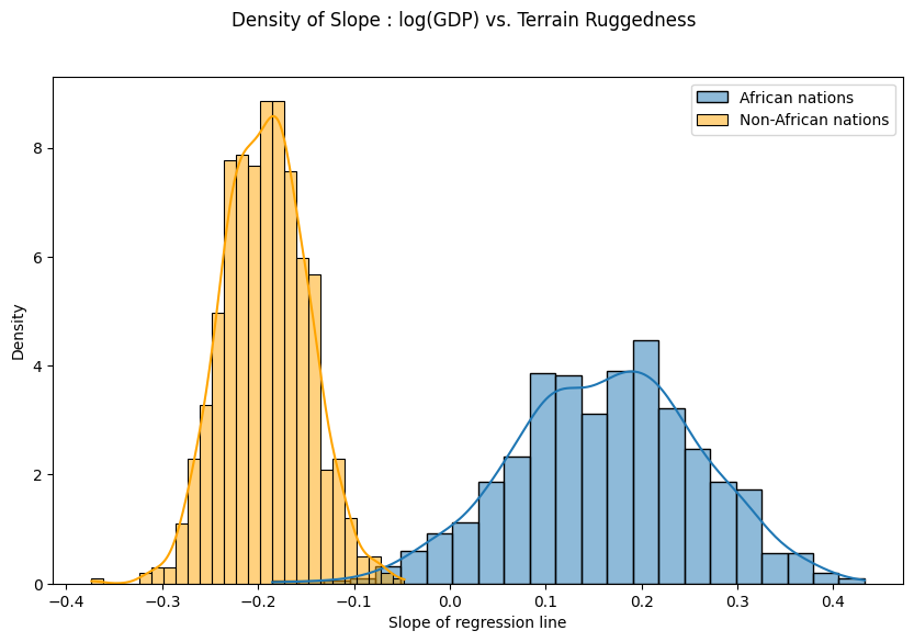 마지막으로, 지형 울퉁불퉁함과 GDP 사이의 관계가 우리 모델의 매개 변수 추정치의 불확실성에 대해 얼마나 견고한지에 대한 이전의 질문을 다시 살펴보자. 이를 위해 아프리카 안팎의 국가에 대한 지형 울퉁불퉁함을 고려한 로그 GDP의 기울기 분포를 그린다.