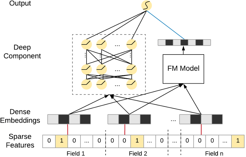 DeepFM은 sparse feature를 가정하고 FM 모델과 Deep 모델을 같이 고려하는 방식이다.