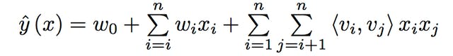 위의 두 내적 $<v_i , v_j >$ 같은 경우 두 변수의 interaction을 다음과 같이 표현했는데, 이는 $v_i$ , $v_j$ 는 intersection의 latent vector인데, sprae 한 것은 dense 하게 표현함으로써, 독립성이 깨지면서 교호 작용을 학습할 수 있게 된다고 한다.