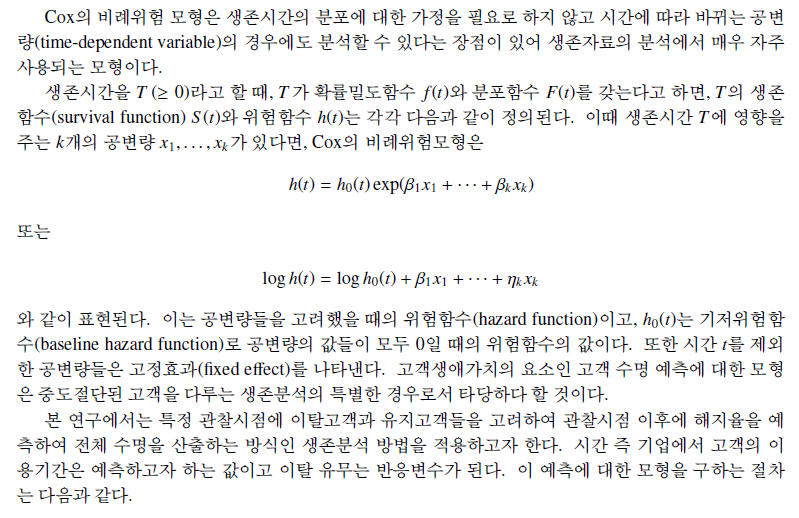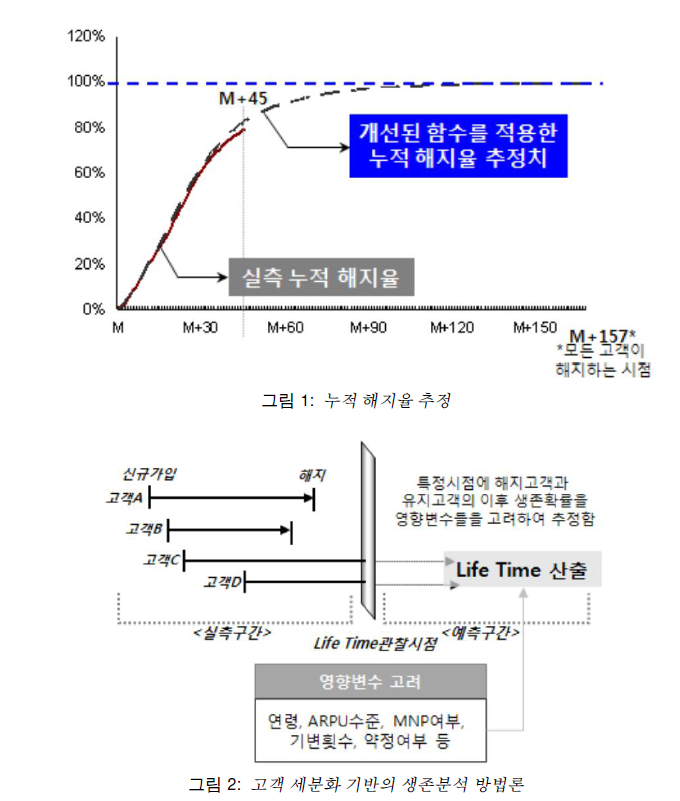 또 고객의 수명예측은 고객 개별에 대한 고객수명을 예측하기보다는 집단의 월별 평균 해지율이나 월별 평균 이탈률을 가지고 집단의 평균적 수명을 예측하고 있는 실정이다. (2011년 논문이라 맞지 않을 수 있다.)