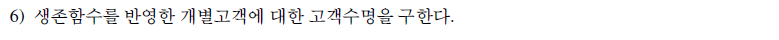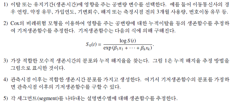 즉 각각 동질의 고객들로 이루어진 세그먼트의 과거 그 기업의 상품을 이용한 기간 동안의 정보를 기반으로 생존함수를 구해 각 개별 고객의 미래이용기간을 예측함으로써 각 개별 고객이 그 회사에 남아 있을 전체 수명을 예측하는 방법이다