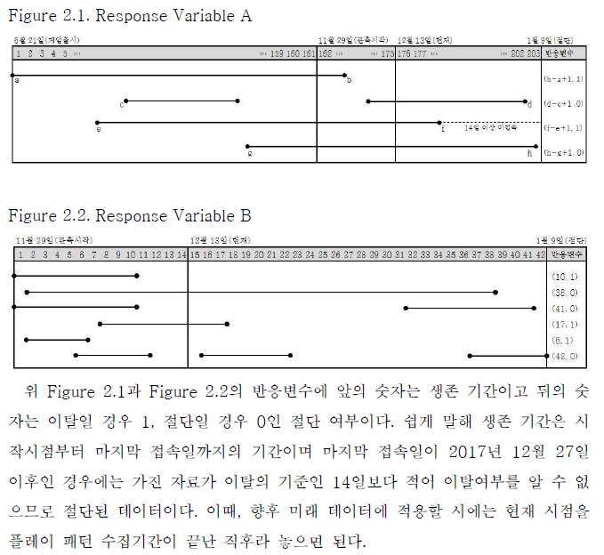 저자는 절단된 시점을 기준으로 14일간의 미접속 여부에 따라 해당 유저가 잔존하는지 여부를 결정하는 식으로 정의했고,
