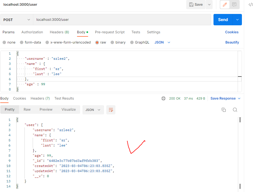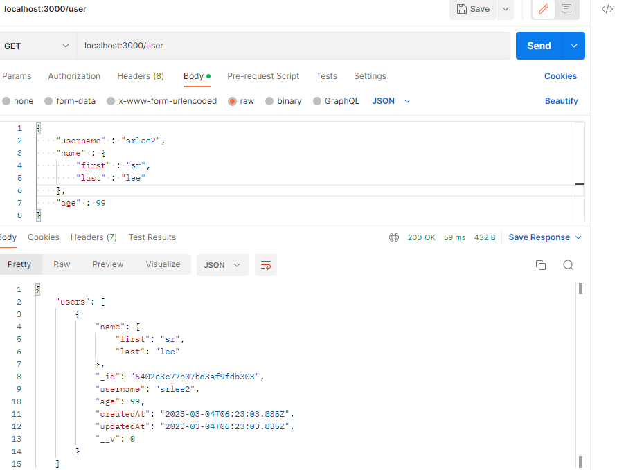 mongoose는 아쉬운 점이 /user에서 User 객체를 수정해서 업데이트하면 반영되지만, 그냥 바꿔버리면 required를 만족하지 않고 그냥 넘어갈 수도 있다.
