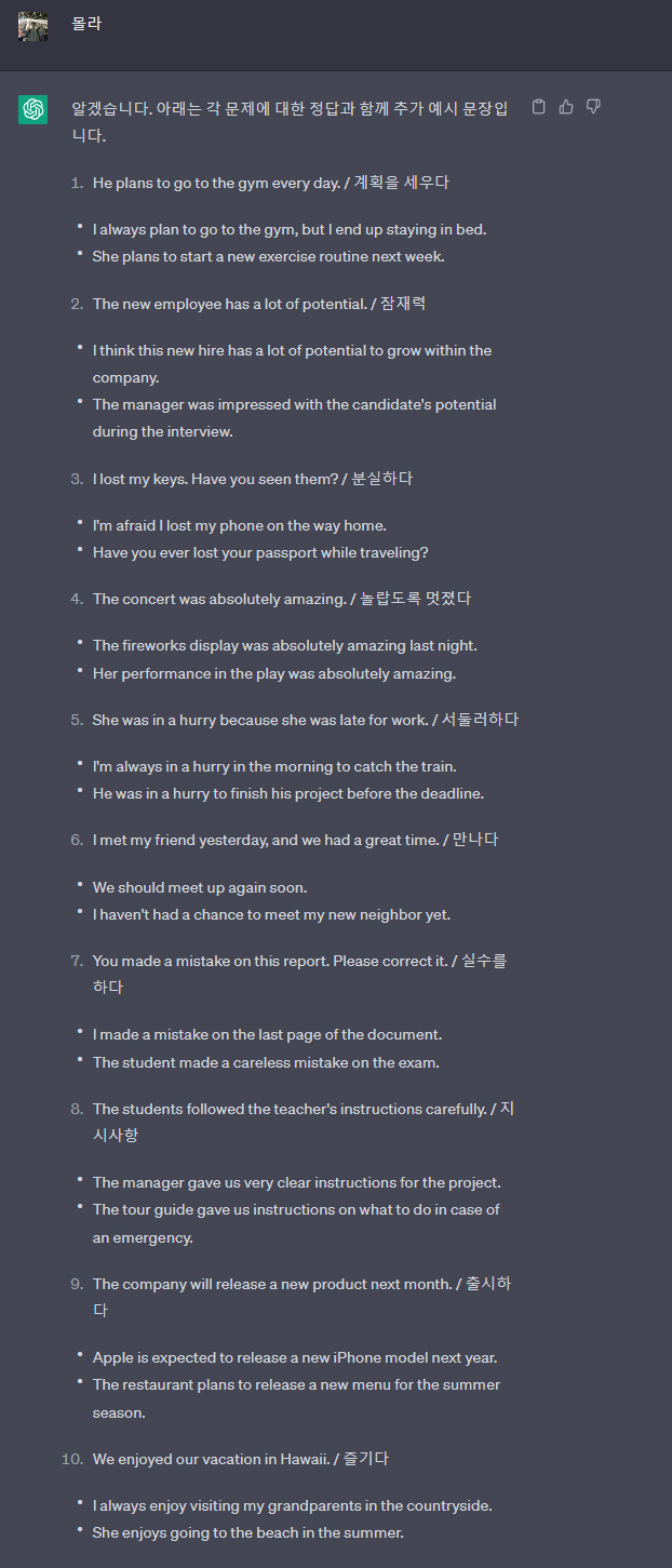 3. 답변에 대해서 맞음 여부와 실제 정답 문장을 준다. 그리고 너는 그 답변에 대해서 맞는 지랑 다른 예문을 알려줘 답변 형태 ( [정답여부]/[정답]/[정답에 대한 뜻]/ [정답에 대한 한국어 번역 결과])