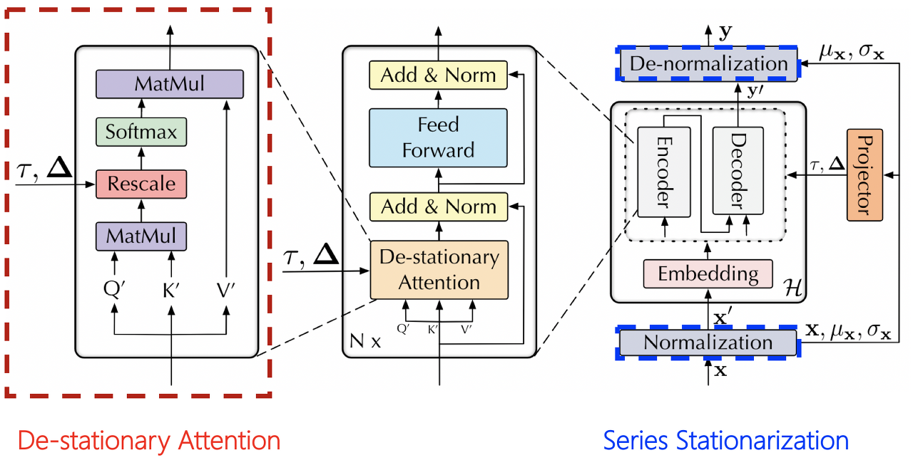 Trnasformer 기준으로 De-stationary 코드는 다음과 같다.