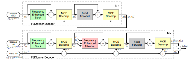 이 모델은 시간 데이터의 계절 및 순환 표현을 만드는 것을 목표로 하는 계절 분해 메커니즘을 특징으로 합니다. 디코더는 세 가지 항목을 수집합니다. 디코더는 예측에 함께 추가되는 계절 부분과 추세 부분을 출력합니다. Autoformer 논문 2페이지의 그림.