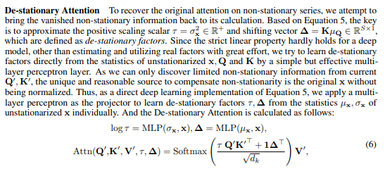 비정상적인 시계열 데이터에서 원래의 어텐션을 복구하기 위해, 사라진 비정상 정보를 다시 계산에 반영하려고 합니다. 식 5에 기반하여, 주요한 것은 양의 스케일링 스칼라인 τ = σ²ₓ ∈ R⁺과 이동 벡터인 ∆ = KµQ ∈ Rᵀ×¹를 비정상 해소 요소로 근사화하는 것입니다. 깊은 모델에서 엄격한 선형성이 거의 성립하지 않기 때문에, 실제 요소를 추정하고 활용하는 대신 비정상화되지 않은 x, Q 및 K의 통계량으로부터 비정상 해소 요소를 직접 학습하는 간단하고 효과적인 다층 퍼셉트론 레이어를 사용합니다. 현재 Q₀, K₀에서는 제한적인 비정상 정보만을 발견할 수 있기 때문에 비정상성을 보상하기 위한 독특하고 합리적인 소스는 정규화되지 않은 원래 x입니다. 따라서 식 5의 직접적인 딥러닝 구현으로서, 비정상화 요소 τ, ∆를 비정상화되지 않은 x의 통계 µₓ, σₓ에서 개별적으로 학습하기 위해 다층 퍼셉트론을 프로젝터로 적용합니다. 그리고 비정상 해소 어텐션은 다음과 같이 계산됩니다.