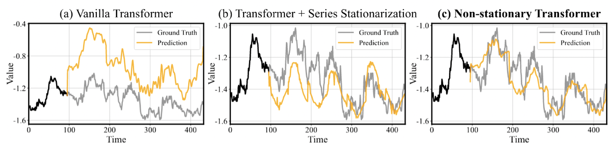 저자들은 비정상 시계열을 처리하기 위해 변압기를 더 잘 적응시키는 것을 목표로 합니다. 그들은 de-stationary attention와 a series stationarization mechanism이라는 두 가지 메커니즘을 사용합니다.
