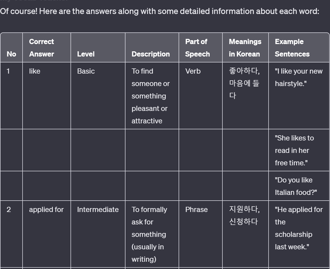 - 디테일한 수준으로 요청하는 것도 가능함. (중학교 수준, 중학교 수준의 비즈니스 어휘 등등)