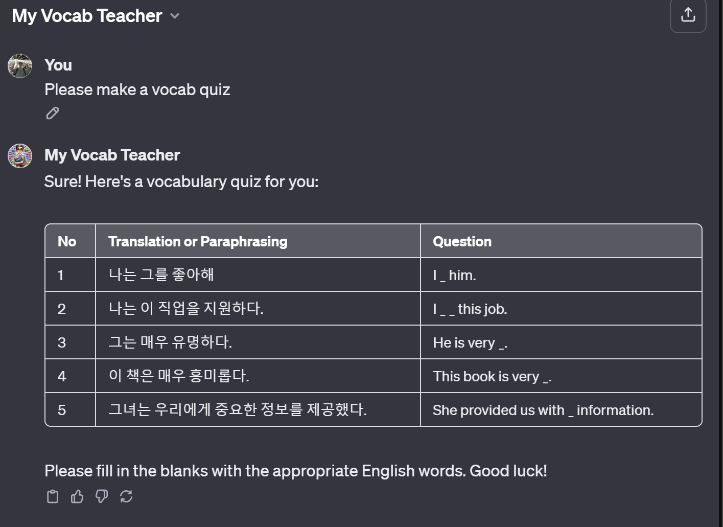 2023.04.29 - [관심있는 주제/ChatGPT Prompt] - ChatGPT) 영단어 빈칸 문제 내는 프롬프트 공유