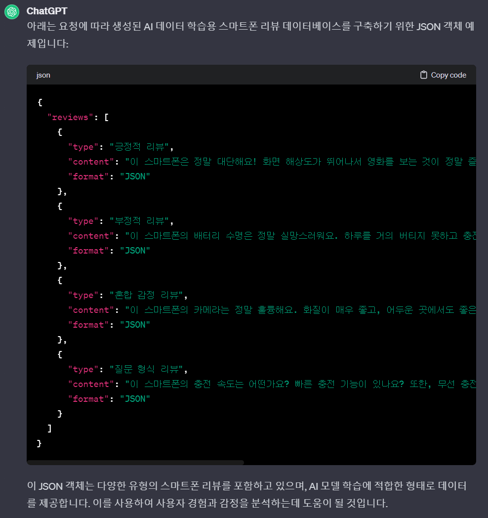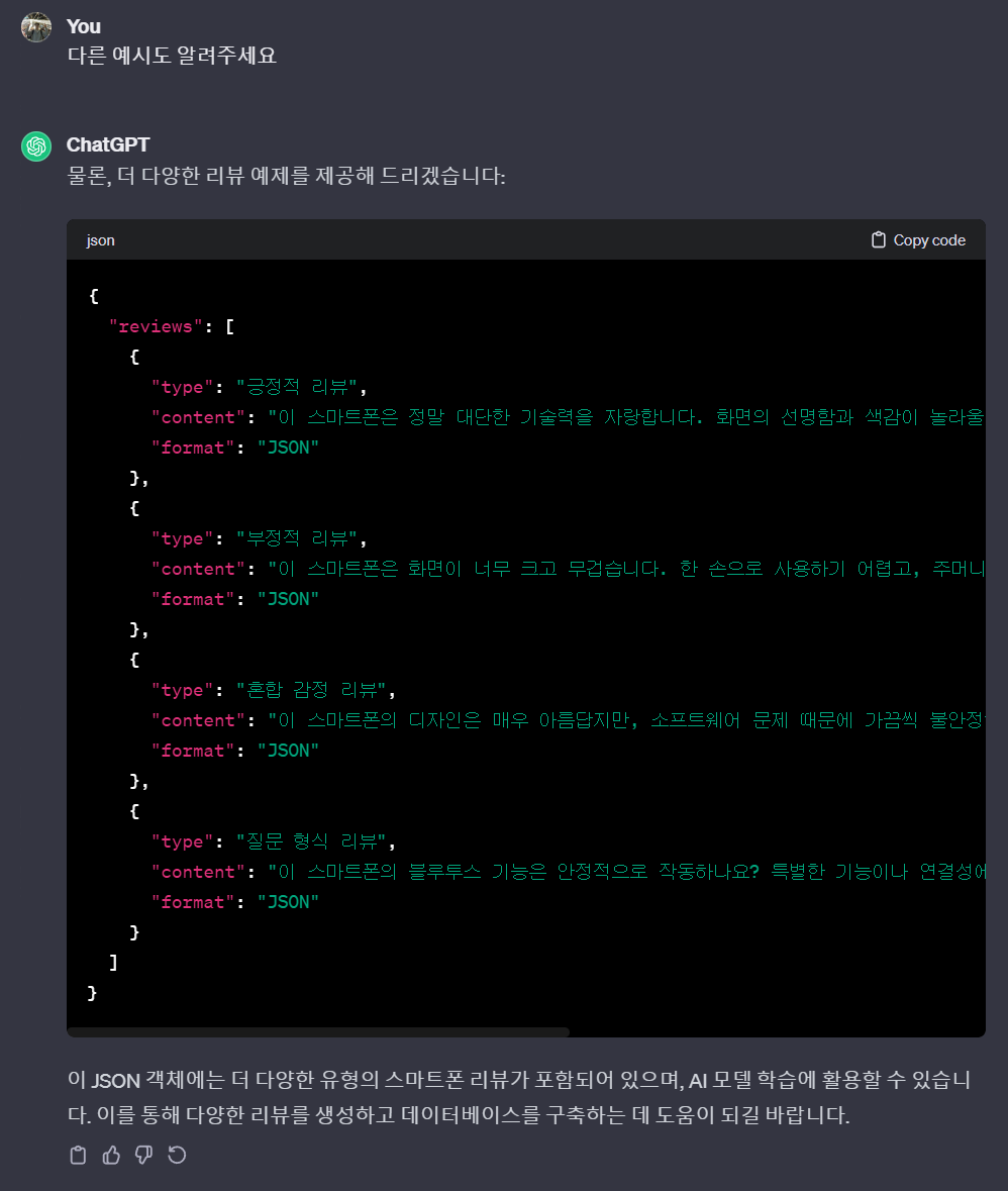 "AI 데이터 학습용 스마트폰 리뷰 데이터베이스를 구축하는 프로젝트의 리더로서, 다음과 같은 지시사항에 따라 다양한 유형의 리뷰를 생성하고, 각 리뷰를 하나의 JSON 객체 안에 포함시켜 반환해 주세요: json { "reviews": [ { "type": "긍정적 리뷰", "content": "이 스마트폰은 내 생활을 더 편리하게 만들어줍니다. 배터리 수명이 길어서 하루 종일 걱정 없이 사용할 수 있어요!", "format": "JSON" }, { "type": "부정적 리뷰", "content": "이 스마트폰의 터치스크린은 너무 민감해서 실수로 앱을 여는 일이 잦아요. 사용자 인터페이스도 직관적이지 않아서 불편합니다.", "format": "JSON" }, { "type": "혼합 감정 리뷰", "content": "이 스마트폰의 카메라 품질은 매우 인상적이지만, 가격이 너무 비싸요. 가성비를 중시하는 소비자에게는 추천하기 어렵습니다.", "format": "JSON" }, { "type": "질문 형식 리뷰", "content": "이 스마트폰의 보안 기능은 어떤가요? 안면 인식이나 지문 인식이 안정적으로 작동하나요?", "format": "JSON" } ] } 이렇게 구성된 JSON 객체는 AI 모델 학습에 적합한 형태로 데이터를 제공합니다. 이는 다양한 사용자 경험과 감정을 포괄적으로 분석하는 데 도움이 됩니다." 코드를 사용하지 않고 content를 다양하게 작성해 주세요