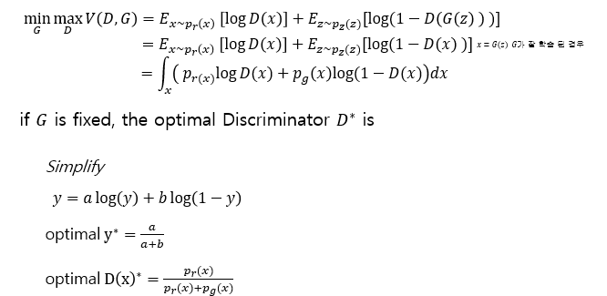 그다음 G는 고정시키고 D의 최적화를 할 때! y에 대해서 optimal을 구하게 되면 다음과 같이 최적의 값이 나온다.