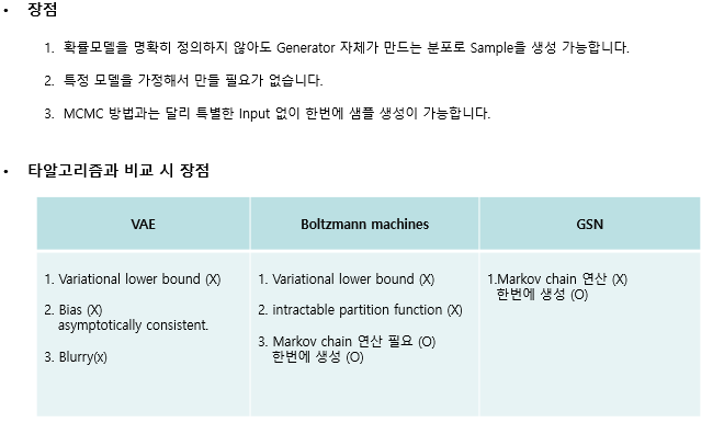 앞에서 언급한 것처럼 GAN은 Implicit density로 추정하는 sampler이기 때문에 MCMC 같은 마코프 체인이 없이 한 번에 생성할 수 있다는 것이 큰 장점이고 , VAE같이 Lower bound 같은 부분도 없다! 그래서 VAE보다 blurry 한 것을 만들지도 않는다!!
