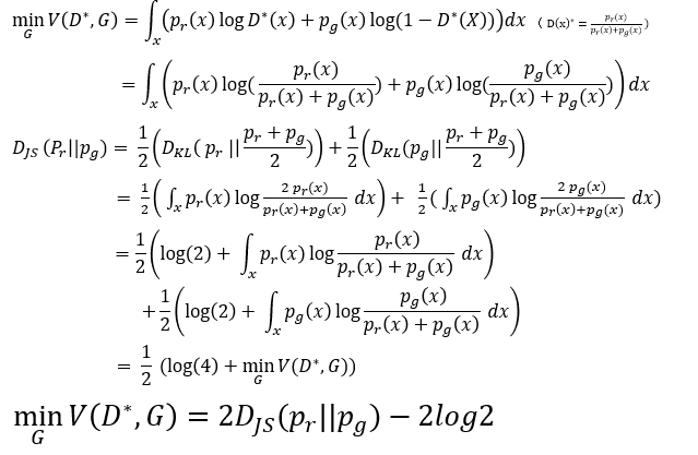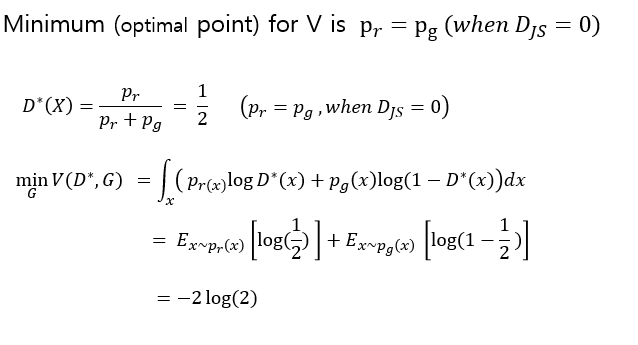 근데 이 식을 잘 보면 JS Divergence의 일부인 것을 확인할 수 있다. 그래서 만약 JS는 항상 양수니까 저것이 최적화가 되면 0이 되고 그때 가장 작은 값은 -2 log 2가 된다고 한다.