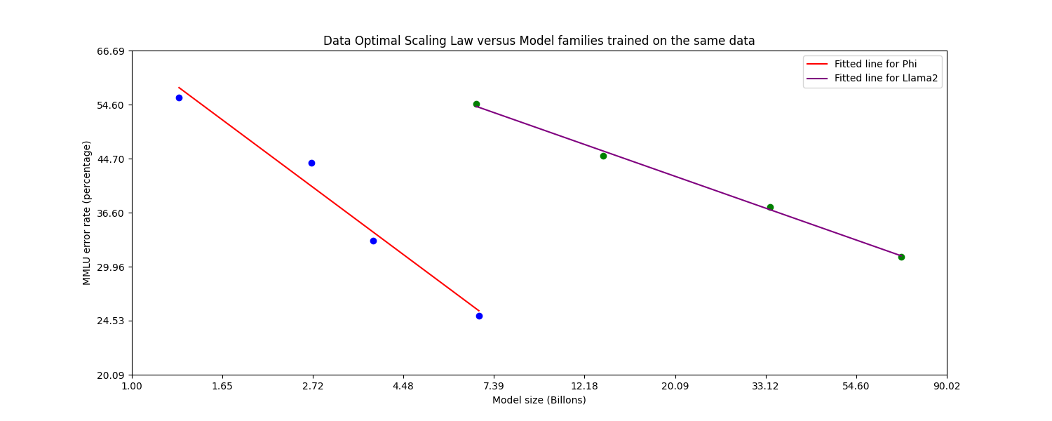 "데이터 최적 체제"에 근접한 스케일링 법칙을 보여주며, phi 모델 시리즈(Phi-1.5, Phi-2, Phi-3-mini, Phi-3-small)와 Llama-2 모델 시리즈(7B, 13B, 34B, 70B)를 같은 데이터셋으로 훈련시킨 결과를 비교한 그래프입니다. 그래프는 모델 크기(모델의 파라미터 수)의 로그값과 MMLU(Massive Multitask Language Understanding) 오류율의 로그값을 축으로 사용하여, 모델의 크기가 커질수록 성능이 어떻게 변화하는지 보여줍니다.