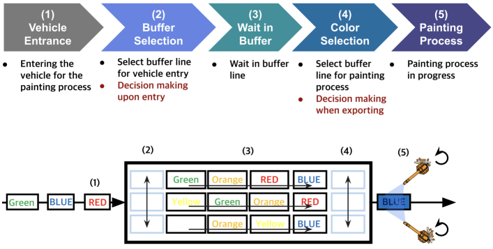 - 의사결정 필요성: 차량이 도장 공정으로 이동할 때 어떤 버퍼 라인으로 보낼지 결정해야 합니다.