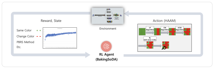 - 강화학습의 역할: 에이전트는 차량의 현재 상태와 버퍼의 상태(예: 현재 대기 차량 수, 색상 등)를 고려하여 최적의 이동 경로를 결정합니다. 이는 도장 공정의 효율성을 높이고 색상 변경 횟수를 줄이는 데 기여합니다.